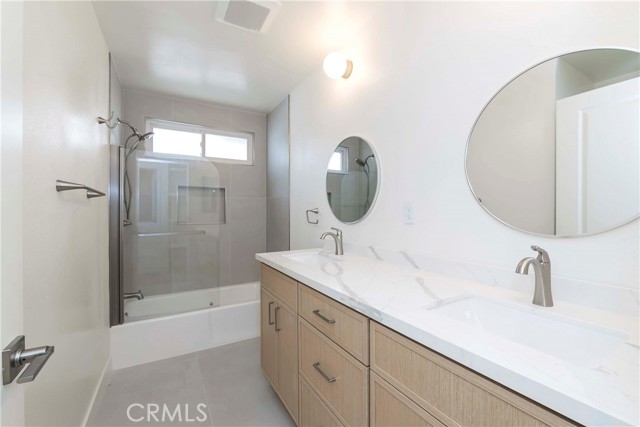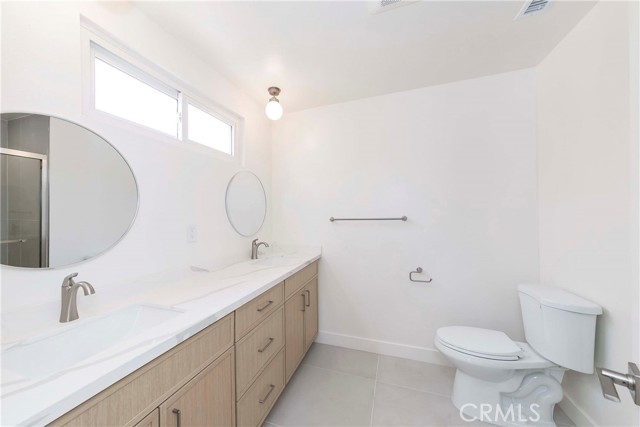 This home offers three generously sized bedrooms, including a large primary suite with a private bathroom featuring dual sinks and a walk-in shower. A separate beautifully renovated hallway bathroom also includes dual sinks and a bathtub.