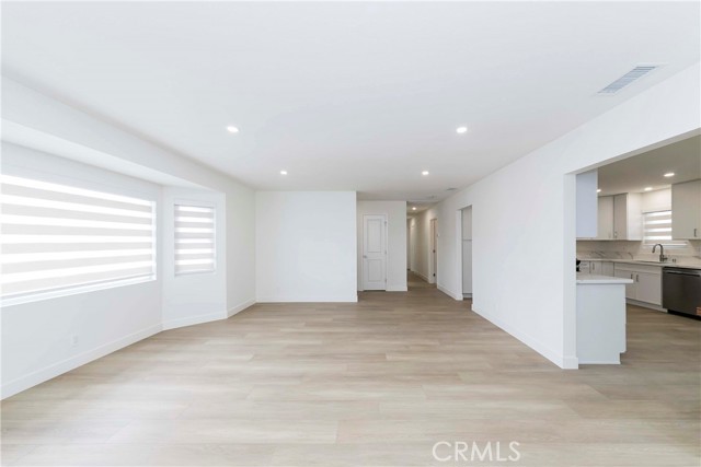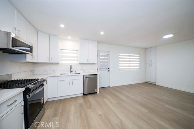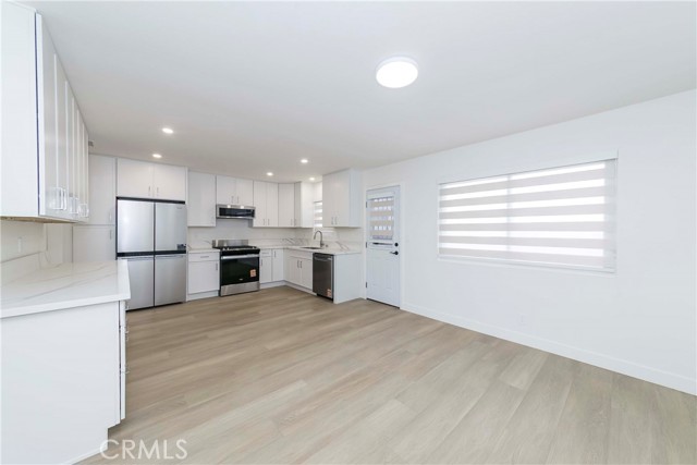 Step into a spacious living room filled with natural light from large south-facing windows, flowing seamlessly into an oversized kitchen with white cabinetry, quartz countertops, and brand-new stainless steel appliances. The expansive dining area within the kitchen provides plenty of space for everyday meals and entertaining.