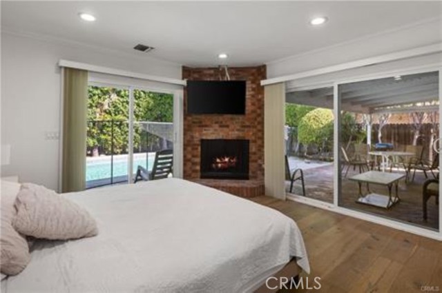 Sliding glass doors lead to a covered patio, private yard, and sparkling pool — ideal for relaxing or hosting gatherings. Two spacious master suites with luxurious bathrooms add a touch of elegance.