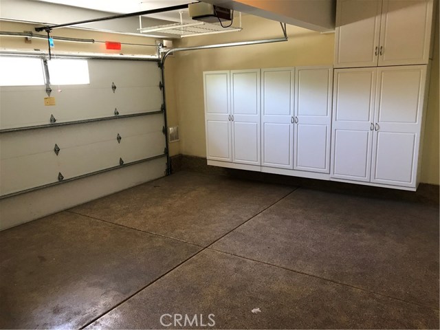 The oversized 2-car garage features epoxy-coated floors and extensive built-in cabinetry, offering exceptional storage space.