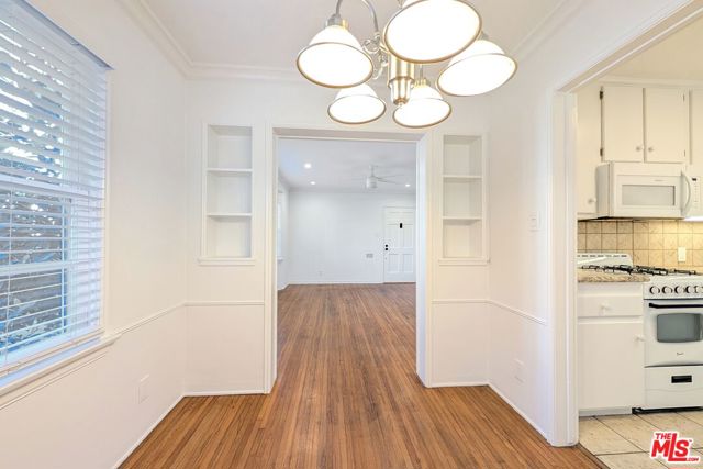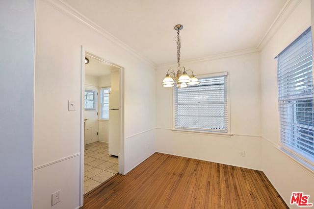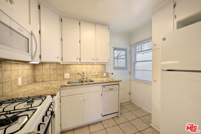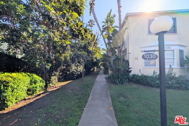 Charming one bedroom / one bath ground floor apartment with front and back door and private patio. Quiet, residential street 1 1/2 blocks from the 3rd Street Promenade and near the California Incline leading to the beach. Bright end unit with three exposures in a lush, green setting. Living room with bay window overlooking yard and dining room with corner windows and chandelier. Kitchen with under-cabinet lighting, dishwasher, and built-in microwave hood. Hallway with lots of closet space leads to renovated bathroom. Bedroom with walk-in closet includes automatic lighting. Recessed lighting with dimmers and window treatments throughout the entire unit. Well-kept original hardwood floors. Back door off the kitchen leads to private patio and common laundry room at the end of a walkway. Parking available.