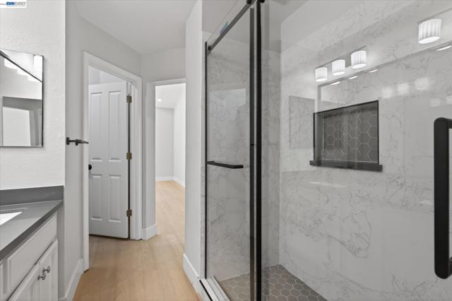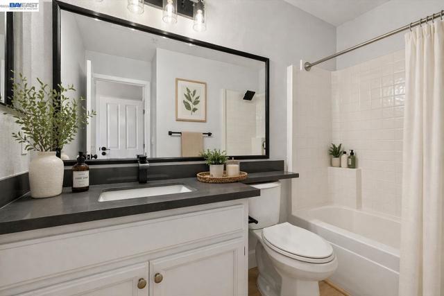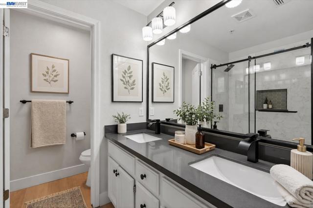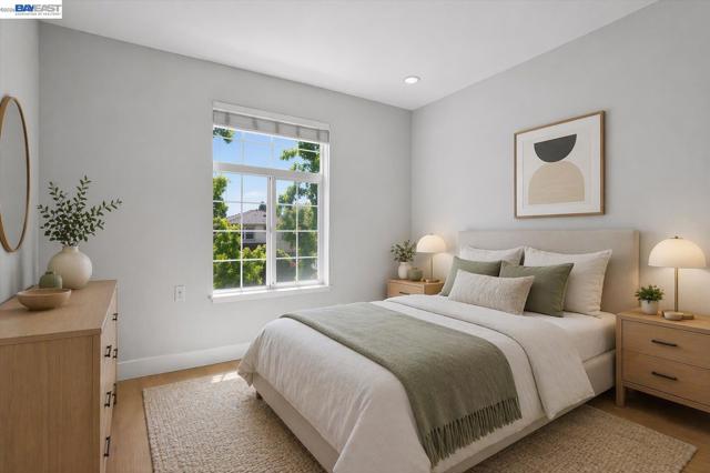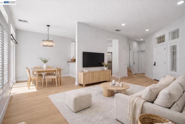 Northeast-facing and fully renovated, this bright and airy end-unit townhouse offers exceptional privacy with no rear neighbors and a prime court-front location in the desirable Siena community. Featuring two spacious bedroom suites, 2.5 baths, and a two-car attached garage with extra storage, the home has just undergone $60,000 in upgrades, including brand-new flooring, fresh interior and cabinet paint, updated lighting, a new dining and foyer chandelier, and beautifully remodeled bathrooms highlighted by a modern primary suite with a walk-in shower and dual vanities. The open-concept main level showcases a large living room flowing into the dining area and a well-appointed kitchen with granite countertops, full backsplash, stainless steel appliances, a gas cooktop, and bar seating, plus a convenient powder room and laundry closet. Step outside to a low-maintenance stamped concrete backyard, perfect for indoor-outdoor living. Upstairs, enjoy additional storage on the landing, a spacious primary suite with high ceilings and walk-in closet, and a secondary en-suite bedroom. Residents benefit from top-rated Pleasanton schools and HOA amenities including a pool, spa, clubhouse, tennis courts, trails, parks, and security patrol. Ideally located within walking distance to BART, Iron Horse Trail, and nearby parks, and just minutes from Hacienda Business Park and shopping destinations like Whole Foods and Regal Cinemas, this move-in-ready home combines comfort, style, and convenience.